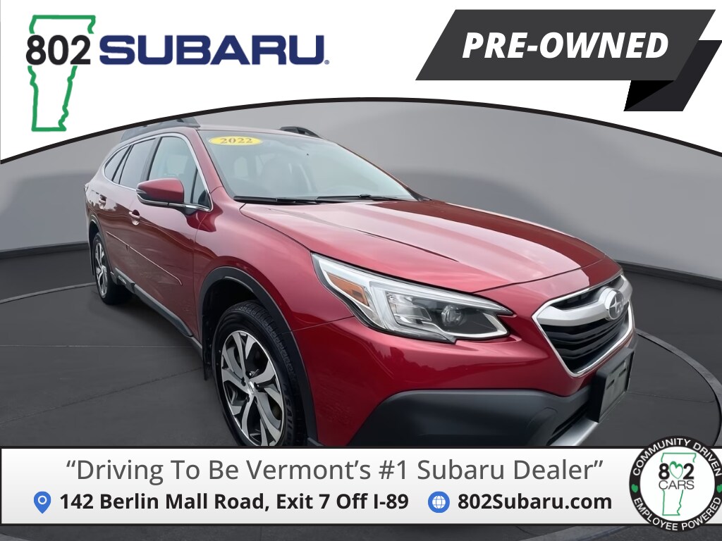 802 Subaru is proud to present you with another True Market Priced Pre-Owned Vehicle. Transparent Pricing Of $ 24784 !! This 2022 Subaru Outback Limited Subaru Certified Pre-Owned is loaded with the following Factory Options: Outback Limited, AWD, and Black Leather Power Moonroof & HSW & Navigation System (DriverFocus (Driver Monitoring System), Heated Steering Wheel, Power Moonroof, and Radio: Subaru STARLINK 11.6" Multimedia Nav System), Outback Limited, Subaru Certified Pre-Owned Certified, AWD, Black Leather, 12 Speakers, 3.90 Axle Ratio, 4-Wheel Disc Brakes, ABS brakes, Air Conditioning, All-Weather Floor Liners, Alloy Wheels, AM/FM radio: SiriusXM, Auto High-beam Headlights, Auto-Dimming Exterior Mirror w/Approach Light, Auto-dimming Rear-View mirror, Automatic temperature control, Brake assist, Bumpers: body-color, Compass, Crimson Red Pearl Body Side Molding, Dome Light LED Upgrade, Driver door bin, Driver vanity mirror, Dual front impact airbags, Dual front side impact airbags, Electronic Stability Control, Emergency communication system: STARLINK Safety and Security (Subscription Required), Exterior Parking Camera Rear, Four wheel independent suspension, Front anti-roll bar, Front Bucket Seats, Front Center Armrest w/Storage, Front dual zone A/C, Front Fog Lights, Front reading lights, Fully automatic headlights, Garage door transmitter: HomeLink, harman/kardon® Speakers, Heated Door Mirrors, Heated Front Bucket Seats, Heated Front Seats, Heated Rear Seats, Illuminated entry, Knee airbag, Leather steering wheel, Low tire pressure warning, Memory seat, Occupant sensing airbag, Outside temperature display, Overhead airbag, Overhead console, Panic alarm, Passenger door bin, Passenger vanity mirror, Perforated Leather-Trimmed Upholstery, Power door mirrors, Power Drivers Seat, Power Liftgate, Power passenger seat, Power steering, Power windows, Radio: Subaru STARLINK 11.6" Multimedia Plus Sys, Rear anti-roll bar, Rear Bumper Cover, Rear Seat Back Protector, Rear seat center armrest, Rear window defroster, Rear window wiper, Remote keyless entry, Roof rack, Security system, Speed control, Speed-sensing steering, Split folding rear seat, Spoiler, STARLINK/Apple CarPlay/Android Auto, Steering wheel mounted audio controls, Steering Wheel Paddle Shift Control Switches, Tachometer, Telescoping steering wheel, Tilt steering wheel, Traction control, Trip computer, Turn signal indicator mirrors, Variably intermittent wipers, and Wheels: 18" x 7J Black Aluminum Alloy!!