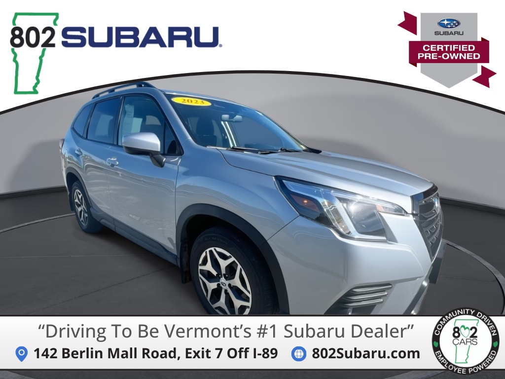 802 Subaru is proud to present you with another True Market Priced Pre-Owned Vehicle. Transparent Pricing Of $ 24385 !! This 2023 Subaru Forester Premium Subaru Certified Pre-Owned is loaded with the following Factory Options: Forester Premium, Lineartronic CVT, AWD, Ice Silver Metallic, and Black Cloth Standard Model, Forester Premium, Subaru Certified Pre-Owned Certified, Lineartronic CVT, AWD, Ice Silver Metallic, Black Cloth, 3.70 Axle Ratio, 4-Wheel Disc Brakes, 6 Speakers, ABS brakes, Air Conditioning, Alloy Wheels, AM/FM radio: SiriusXM, Anti-whiplash front head restraints, Auto High-beam Headlights, Automatic temperature control, Brake assist, Bumpers: body-color, CD player, Driver door bin, Driver vanity mirror, Dual front impact airbags, Dual front side impact airbags, Electronic Stability Control, Emergency communication system: STARLINK Safety and Security (Subscription Required), Exterior Parking Camera Rear, Four wheel independent suspension, Front anti-roll bar, Front Bucket Seats, Front Center Armrest, Front Fog Lights, Front reading lights, Fully automatic headlights, Heated Door Mirrors, Heated Front Bucket Seats, Heated Front Seats, Illuminated entry, Knee airbag, Low tire pressure warning, Occupant sensing airbag, Outside temperature display, Overhead airbag, Overhead console, Panic alarm, Passenger door bin, Passenger vanity mirror, Power door mirrors, Power Drivers Seat, Power moonroof: Panoramic, Power steering, Power windows, Premium Cloth Upholstery, Radio data system, Radio: Subaru Starlink 6.5" Multimedia Plus System, Rear anti-roll bar, Rear seat center armrest, Rear window defroster, Rear window wiper, Remote keyless entry, Roof rack: rails only, Security system, Speed control, Speed-sensing steering, Split folding rear seat, Spoiler, STARLINK/Apple CarPlay/Android Auto, Steering wheel mounted audio controls, Tachometer, Telescoping steering wheel, Tilt steering wheel, Traction control, Trip computer, Variably intermittent wipers, and Wheels: 17" x 7.0 J Black Machine Finish Alloy!!