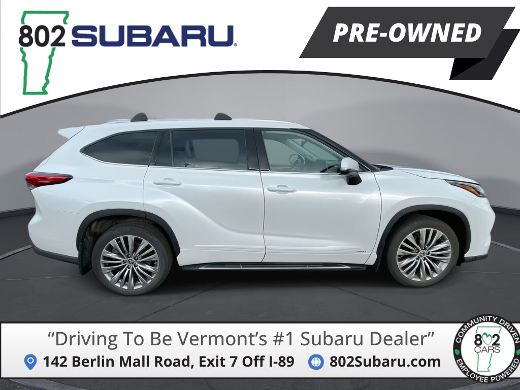 802 Subaru is proud to present you with another True Market Priced Pre-Owned Vehicle. Transparent Pricing Of $ 40873 !! This 2022 Toyota Highlander Hybrid Platinum is loaded with the following Factory Options: Highlander Hybrid Platinum, 2.5L I4 PDI Hybrid DOHC 16V LEV3-SULEV30 186hp, and Black Leather Highlander Hybrid Platinum, 2.5L I4 PDI Hybrid DOHC 16V LEV3-SULEV30 186hp, Black Leather, 11 Speakers, 20" Alloy Wheels, 3rd row seats: split-bench, 4-Wheel Disc Brakes, ABS brakes, Air Conditioning, Alloy Wheels, AM/FM radio: SiriusXM, Apple CarPlay/Android Auto, Auto High-beam Headlights, Auto-dimming Rear-View mirror, Automatic temperature control, Axle Ratio TBD, Brake assist, Bumpers: body-color, Delay-off headlights, Driver door bin, Driver vanity mirror, Dual front impact airbags, Dual front side impact airbags, Electronic Stability Control, Emergency communication system: Safety Connect with 1-year trial, Four wheel independent suspension, Front anti-roll bar, Front Bucket Seats, Front Center Armrest, Front dual zone A/C, Front Fog Lights, Front reading lights, Fully automatic headlights, Garage door transmitter: HomeLink, Heads-Up Display, Heated Door Mirrors, Heated Front Bucket Seats, Heated Front Seats, Heated Rear Seats, Heated steering wheel, High Grade LED, Illuminated entry, Knee airbag, Leather Seat Trim, Leather Shift Knob, Low tire pressure warning, Memory seat, Navigation system: Dynamic Navigation (3-year trial), Occupant sensing airbag, Outside temperature display, Overhead airbag, Overhead console, Panic alarm, Panoramic Moonroof, Panoramic View Monitor, Passenger door bin, Passenger vanity mirror, Power door mirrors, Power Drivers Seat, Power Liftgate, Power Moon-Roof, Power passenger seat, Power steering, Power windows, Radio: JBL Premium Audio System, Rain sensing wipers, Rear air conditioning, Rear anti-roll bar, Rear reading lights, Rear window defroster, Rear window wiper, Reclining 3rd row seat, Remote keyless entry, Roof rack: rails only, Security system, Speed control, Speed-sensing steering, Split folding rear seat, Spoiler, Steering wheel mounted audio controls, Telescoping steering wheel, Tilt steering wheel, Traction control, Trip computer, Turn signal indicator mirrors, Variably intermittent wipers, and Ventilated front seats!!